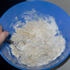 In large mixer or bowl: mix the flours, 1/4 cup sugar, baking soda, baking powder and salt. Mix well. Cut the butter into small pieces and mix into the dry mixture with fingertips.