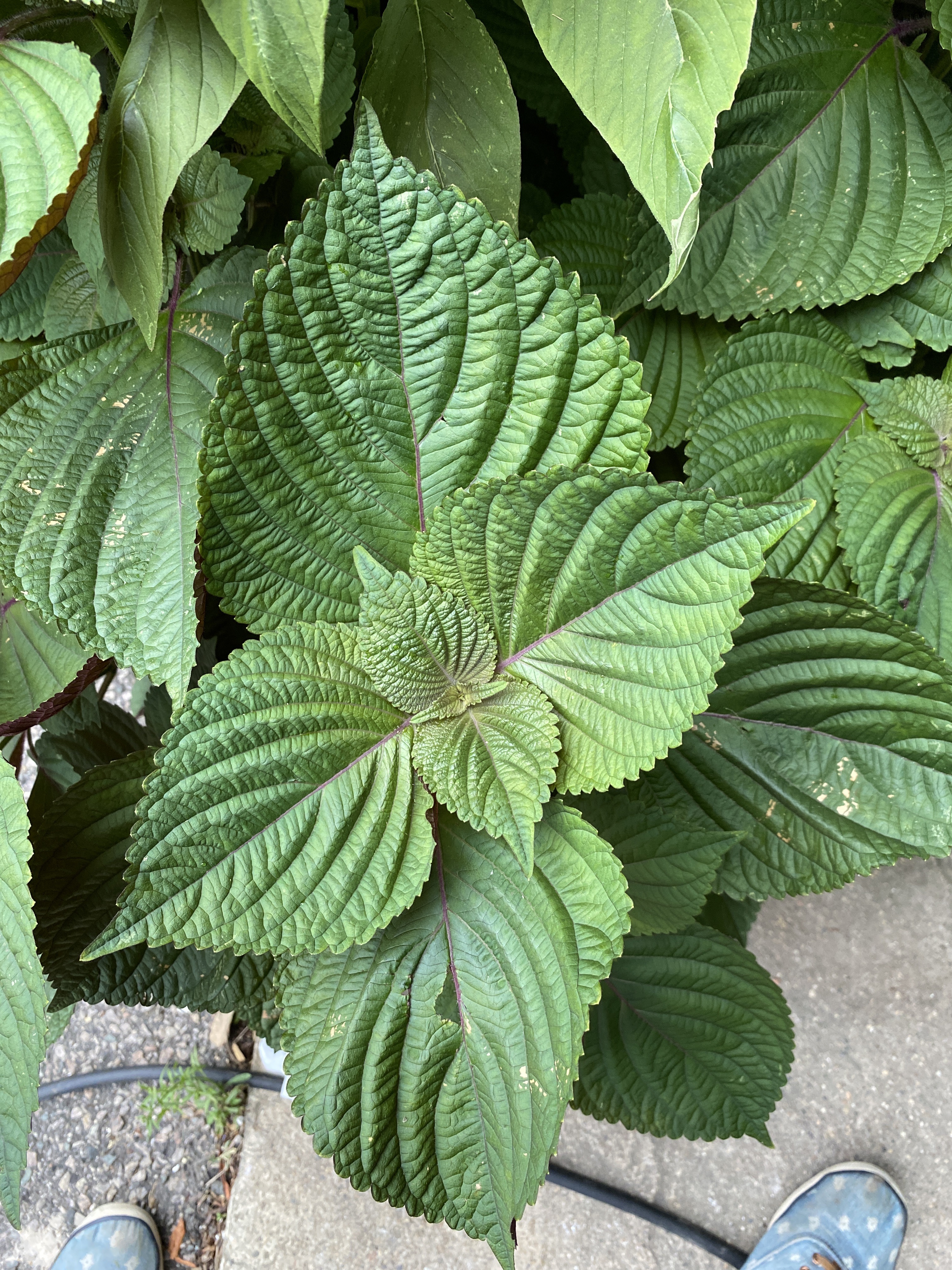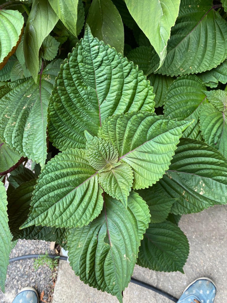These big beautiful leaves are purple on their underside. They have a sortoff savory-cinnamon scent. They can be eaten raw, wrap meat or rice in them and chow down.